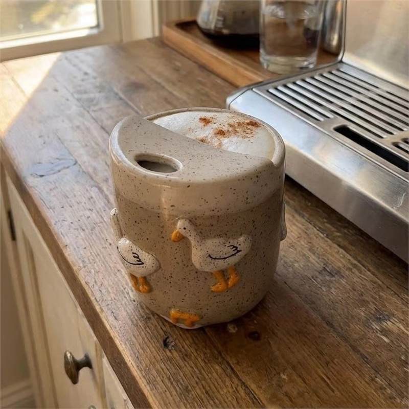This whimsical ceramic mug features a parade of happy little ducks "climbing" and waddling around the cup in adorable 3D relief. Handcrafted speckled glaze gives it a cozy, rustic farmhouse vibe — like a flock of friendly ducks decided to make your coffee break way more fun.
